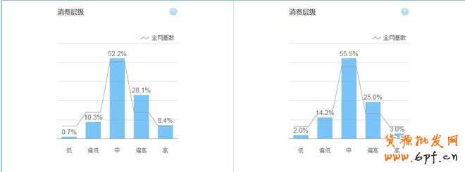 柱形是這個詞的消費基數(shù),線型全網(wǎng)的消費基數(shù)。基本上都是中層消費等級居多。