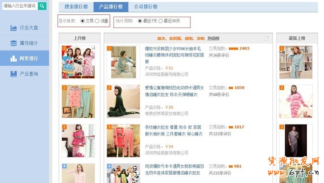 下面看下阿里排行,這個是產品排行榜,可以選擇統計時間是7天或者30天,還可以選擇交易或者流量維度,流量維度就是看的人多的產品。