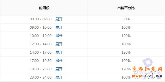 寶貝設定店鋪最大目標人群為上班族,根據淘寶通用的日流量分布和店鋪的流量情況分析,入店流量+成交流量集中在上午10:00-12:00,下午14:00-16:00,晚上:19:00-22:00。所以直通車的推廣時間在高流量時段加大投放:
