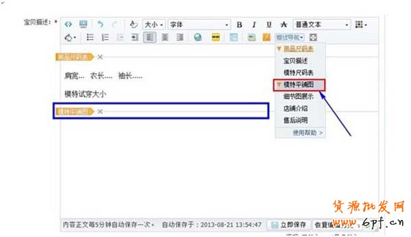 3、編輯完尺碼內(nèi)容后,可以繼續(xù)插入其他導(dǎo)航內(nèi)容,例如“模特平鋪圖”
