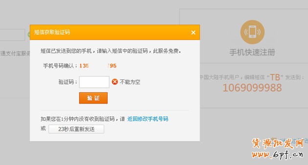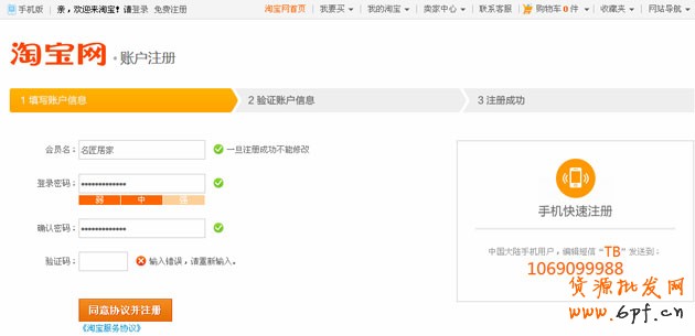 填寫手機號碼,必須是未被注冊使用的手機號。 進入該頁面,說明之前提交的注冊信息已成功,此時您已有了一個未激活的淘寶賬戶,需要輸入手機收到的校驗碼進行激活,若您不小心把該頁面關閉了,不用著急,進入登錄頁面輸入賬戶名和密碼,點擊“登錄”該頁面又會出現。 詳細<<