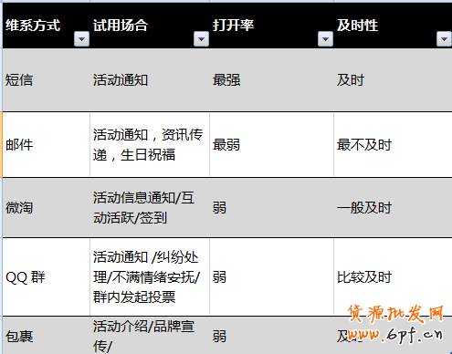 要做好客戶維系,維系渠道的選擇十分重要,不同渠道不同特性,店鋪應該根據實際情況來選擇。通常來說,客戶維系的渠道包括短信、郵件、微淘、QQ群和包裹,以下是珀萊雅整理的各個渠道的特點: