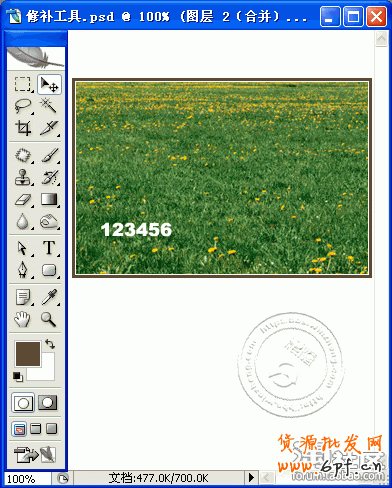 操作的方法與仿制圖章工具相似。按住Alt鍵,在無文字區域點擊相似的色彩或圖案采樣,然后在文字區域拖動鼠標復制以復蓋文字。只是修復畫筆工具與修補工具一樣,也具有自動匹配顏色的功能,可根據需要進行選用。