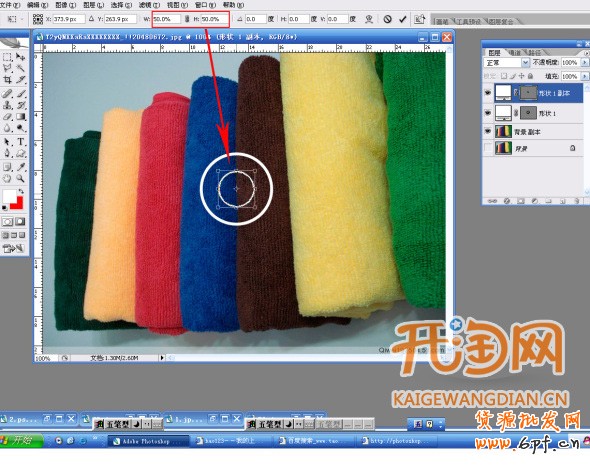 6、按Ctlr+T將圖層副本轉換成自由變換狀態,在設置欄中點擊小鎖鏈,在長寬數值欄中分別輸入50%,按回車鍵即可。這時就可以在原縮放中心不變下將圖層副本縮小一半。