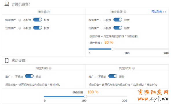 ② PC端設備投放半關閉,只關閉淘寶站內,開啟站外+無線模式,點擊成本低,點擊單價高可實現低價引流策略(大類目下適用性高,可進一步嘗試)。