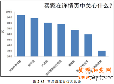 如圖2-85所示是買家在商品描述頁中對構成元素的關注程度,最受關注的是買家的評價,其次是實拍的細節圖,甚至服裝的吊牌買家也很想看,這就說明了我們在選擇元素的時候千萬不要用自己的喜好來決定該放置什么。一是把前面羅列出來的34個元素先放置進去,然后再根據買家的需求來增加或者減少元素。