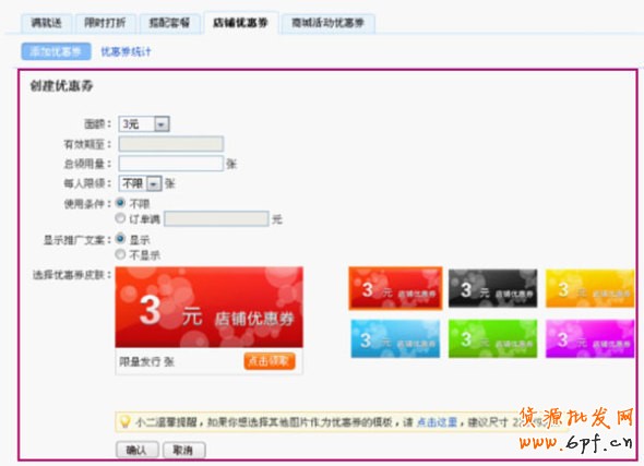 第二步:點(diǎn)擊“添加優(yōu)惠券”下面的“創(chuàng)建活動”按鈕,創(chuàng)建新的優(yōu)惠券活動。然后根據(jù)自己店鋪情況,按照操作提示完成相關(guān)設(shè)置,最后點(diǎn)“確認(rèn)”即完成了優(yōu)惠券的創(chuàng)建。