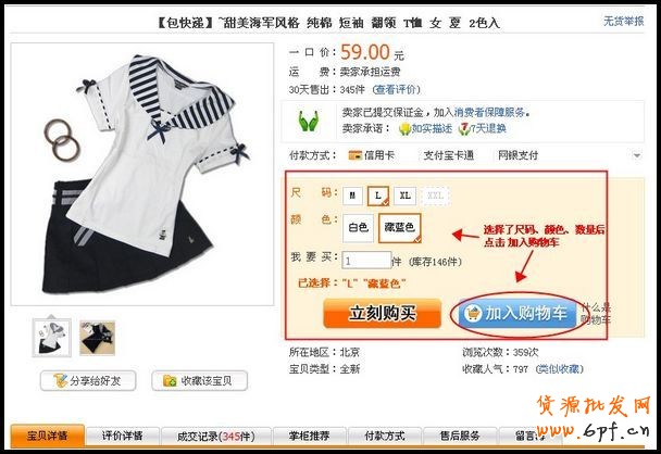在瀏覽寶貝時,您可選擇需要購買寶貝的具體信息:如尺碼、顏色、購買數(shù)量后,逐個加入到購物車中(如圖)。