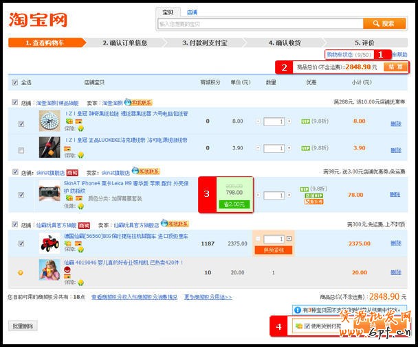 1、右上角的“購物車狀態(tài)”——最多能存放50件寶貝哦,隨時看到購物車的使用狀態(tài),幫助你更好的管理購物車訂單!
