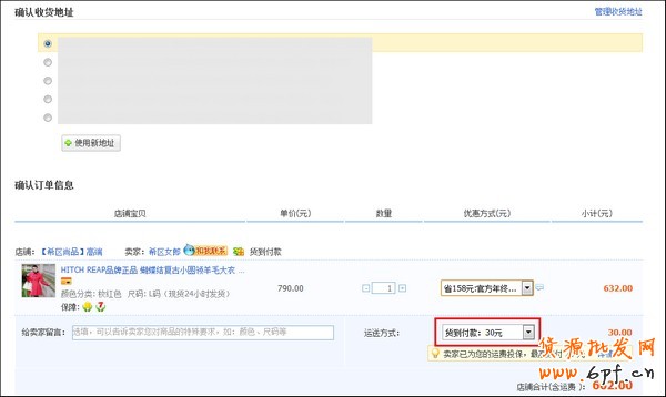 3、購買單件商品點擊“立刻購買”,選擇“運送方式”為貨到付款。買家可以按服務費進行相應的選擇。