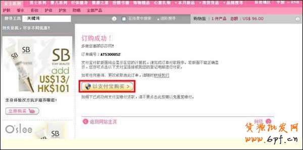 1、在sasa網(wǎng)選好相關(guān)商品之后,確認(rèn)好訂單號(hào),選擇【以支付寶購(gòu)買(mǎi)】;