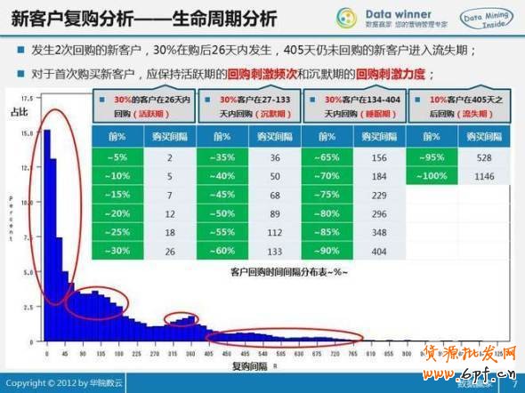 1.這個圖很好理解吧,把說有購買過2次的客戶拉出來,然后計算他們購買第二次時距離第一次購買的時間間隔,然后把這些時間間隔做一個圖。我們發 現,30%的客戶在首次購買后的26天內進行復購,27天-133天的也占30%,134天到404的占30%,405天以上的占10%。說明什么問題 呢?說明距離首次購買的時間越長,復購的可能性越少。這個做CRM的都知道,是廢話來的,有價值的是如何按照這個購買間隔劃分出不同生命周期。