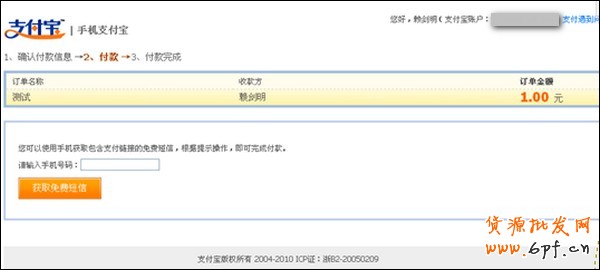 如果用戶沒有綁定手機,輸入手機號碼,點擊“獲取免費短信”,可以接收包含支付鏈接的短信,并跳轉到WAP支付頁面。