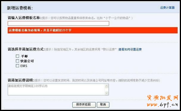 注意:運費模板名稱為必填項,并且不能超過25個字。
