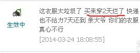買家是3月16日下午14點51簽收的,而買家聯系我們是3月25日晚上21點13分,也就是從買家收到貨到聯系我們中間已經過去了8天.于是我告訴買家我們收到貨會再次確認,如果衣服穿了好長時間,我們拿到廠家也不好退換.剛開如買家不只一次的重復只穿了一次,穿一次就爛了.可當我提出穿的時間長就不好退換時,買家仿佛有些失望了.