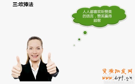 人人都喜歡聽贊美的話,往往我們的一句贊美就能贏得我們的顧客,比如肯定她;親,您真有眼觀選了這款產品,是我們熱銷的哦評價非常好的(或家用效果非常好的)等等這些贊美的語言。這些都是我們對顧客的一個肯定漢贊美。這里有一個顧客希望價格可以優惠些,通過跟顧客的溝通我們知道她是在一個比較好的國企單位,我們就對她進行了一定的吹捧抬高她的位置。她在還價的時候,我們肯定跟她說您不會跟我們計較的,您的單位是比較好的,收入是比較高的,工作的行業也是受到我們敬重的,把顧客捧得高高的,這時顧客相對來說也不好意思還價了,本事產品就是她需要的,在價格的糾結當中,我們用了另一種方式另一個角度。首先肯定這個產品是合適她的其次證明了她有這個購買能力,我們對顧客進行一定的贊美,最后顧客也會很高興的下單。這也是說明了她接受了這樣的贊美和吹捧。雖然我們大家口頭上都在謙虛哎呀你說的太好了什么的,其實內心都是樂于接受別人的贊美。所以我們也要經常贊美我們的顧客。