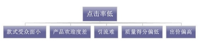 假如一款寶貝,款式是符合爆款潛質的,基礎點擊率也是較好的,但在直通車操作時,由于出價太低,排位很后面,同時創意比較差,關鍵詞又太寬泛不精準,價格也偏高,最終造成點擊率很低。這就會干擾你分析,哪個因素是影響點擊率的核心問題,可能會誤判為款式問題,最終放棄推廣。