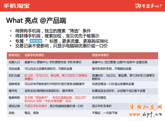 A: ①38手機生活節的主打支持;②手機搜索額外加權;③支持大多數營銷折扣的折上折(甚至包括1212和聚劃算);④手機淘寶的搜索篩選項、搜索結果頂部通欄、搜索結果藍標、詳情頁醒目藍標 等;⑤各類目無線場活動的報名(優先條件)等。另外,在PC端,買家可以同時通過詳情頁的掃描二維碼,和天貓詳情頁的成交記錄中的“手機專享”標識認識和進入到手機專享價。