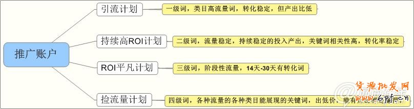 既然每個關(guān)鍵詞都要有它的質(zhì)量得分,那對于每個店鋪的運營能力也要有一個評估,如果每個單品的計劃的推廣質(zhì)量高,每個大得推廣計劃質(zhì)量高,那么你的推廣賬戶會不會得到加權(quán)呢?在這里我只是說我得看法,對不對只有淘寶人知道,剛才說過也許是巧合,我做的時候,都會有相應的提高,這個情況沒有辦法截圖或舉例來證明,也許這個只是我對推廣計劃的一個整理思路,具體有沒有用,需要各位自己去體驗。因為就算有,它的權(quán)重也不會有你想象的那么大!下面說一下我的計劃整體思路,下圖