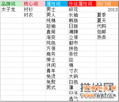 當然,高手們會把這個表格做得更大更多。但是我們是屌絲賣家,這樣就差不多了。這里啰嗦一下,屬性詞是把我們寶貝標題、推廣標題和屬性里有的詞都抽出來,而外延屬性詞是把我們剛才沒有抽到的,但是我們又覺得還挺好的、容易被搜索到的拿來。