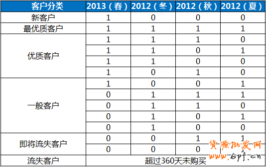 X首先劃分了明確的季節,采用了農歷劃分方法,這樣更體現氣候特點。然后根據客戶是否在各個季節購買過商品,對客戶進行分組。如春夏秋冬都購買過的客人,就將其劃分至最優質客戶組,超過兩個季節未購買的客戶劃分至即將流失客戶組。這樣的劃分使得X對客戶管理即可從兩手抓,第一“手”即把新客戶轉化為回頭客,逐漸培養為優質客戶,另一手即盡量減少客戶流失,以最小的成本挽回客戶。