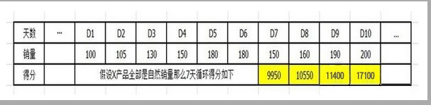 圖中黃色標注的數字,就是X產品在淘寶后臺的7天循環得分(如9950=(D1+D2+D3+D4+D5+D6+D7)*10, 10550=(D2+D3+D4+D5+D6+D7+D8)*10 )只要Y產品在D7-D10任意一天的得分超過了黃色標注的節點數字,X的豆腐塊位置就會被替換下來。就是D7天Y的得分大于9950,D8天Y的得分大于10550,以此類推。這里又有人有疑問了,說,X老早就在豆腐塊了,我們是新產品,得分怎么可能比得上X,說實話,前期你確實比不上X,但是,別忘記了,D8天的得分是從D2-D8天算的,所以說,只要保證起點一樣就可以了。不要有固定思維,再看圖,D1前面我是留了...的,就是說D1前面還有時間,是用來給你的產品積累日銷量到100,只要日銷量達到相同的數字了,你們的起點就一樣了。