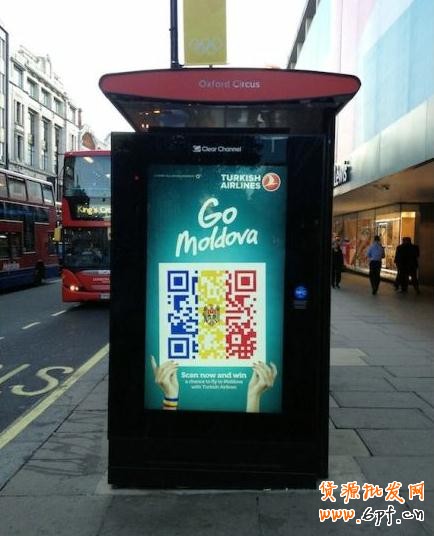 土耳其航空公司用二維碼跟消費(fèi)者玩了一個(gè)“尋寶”游戲,消費(fèi)者可以通過尋找二維碼獲得免費(fèi)機(jī)票。該公司將73個(gè)奧運(yùn)會(huì)參賽國家的國旗制作成二維碼,分別投放到倫敦市內(nèi)94個(gè)公交站點(diǎn),然后邀請(qǐng)人們“尋寶”:參與者只要找到“藏”在公交站的二維碼并用手機(jī)掃描,就能獲取一面國旗,并憑借該國旗在土耳其航空移動(dòng)網(wǎng)站形成自動(dòng)登記。最后,收集最多國旗的人可以從土耳其航空200多條全球航線中任選一個(gè)目的地,獲得一張免費(fèi)的往返機(jī)票。