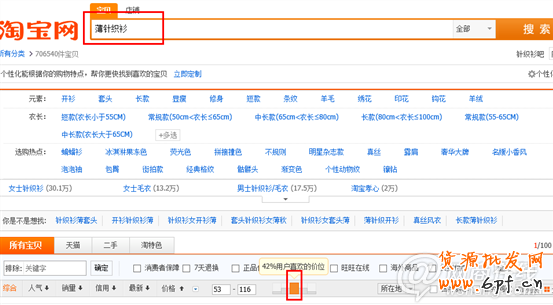 我們搜索一個薄針織衫,發現人群喜好的價格區間是53-116,是不是這塊的價格剛好符合上面我們測試的結果,當然這不是絕對的影響因素,但是這個可以提升你的一項指標就是CTR,也就是點擊率,因為這里的人群會比較雜,大眾的產品的熱衷度高點,這樣你就可以很好的利用你產品的展現機會特別對于新品這個是決定性的指標。