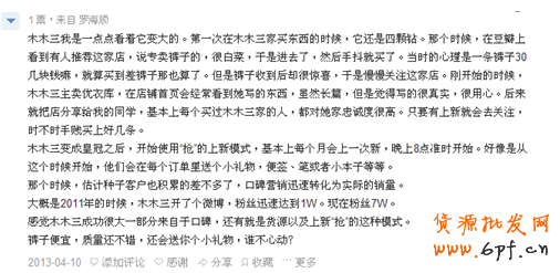 這是我在網上找的木木三的一個老客戶,可能有人會懷疑是托兒。但是我相信絕對不是,為什么?一個連推廣都不屑做的店鋪,更定更加不會用這種低級手段。