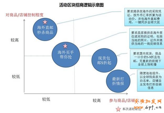 本次活動按全球購賣家的分布及特色品類,分了5個不同的地域站點,北美、歐洲、大洋洲、港澳臺、日韓;分4大區(qū)塊,各區(qū)塊展示全球購的各種特點——既有海外個人賣家的海外大促商品代購、也有貿(mào)易商提供的折扣現(xiàn)貨,而招商方式多樣化,讓更多的賣家用不同的角色參與到全球購大放價的活動中。招商不同區(qū)塊的邏輯如下圖,Y軸體現(xiàn)平臺的手伸的長度/控制的深度,X軸則是實際中賣家參與的深度: