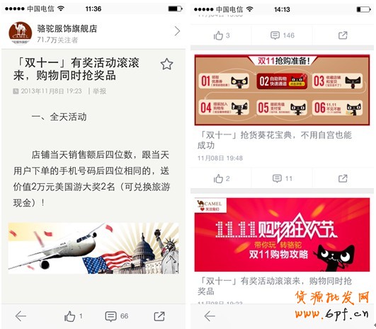 駱駝從10月開始進(jìn)行雙十一預(yù)熱活動(dòng),提供雙十一有關(guān)的游戲和幾項(xiàng)任務(wù),粉絲可憑積分抽獎(jiǎng)。該預(yù)熱活動(dòng),促使粉絲主動(dòng)了解雙十一的活動(dòng)信息,粉絲的回復(fù)率提升了3倍,并促成粉絲提前把心儀商品加入購(gòu)物車。大促當(dāng)天,為了激勵(lì)粉絲搶購(gòu),駱駝在微淘上舉辦了整點(diǎn)秒殺的活動(dòng),促進(jìn)直接銷售額20多萬(wàn)。