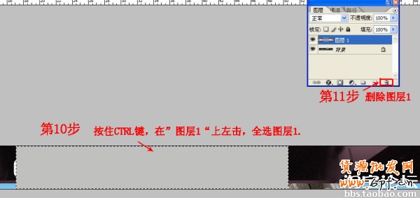 在圖層面板中,選中圖層1,按住CTRL鍵不放,再次點擊圖層1,完成對圖層1的全選,形成寬度950PX、高度150PX的選區->刪除圖層1.