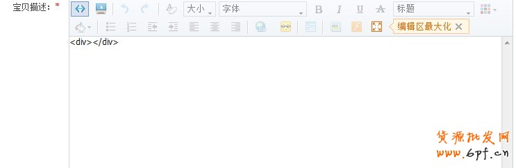 第一步:在寶貝描述中插入div 標簽,并加入樣式。在寶貝描述編輯框中點選第一個“源碼”按鈕,輸入div標簽。div這個標簽是成對出現,且放在符號“<>”中,結尾的標簽要在“<>”中加入“/”,來表示標簽結束。如一對div標簽,寫法就是<div>…</div>(…是指div中具體的內容)。