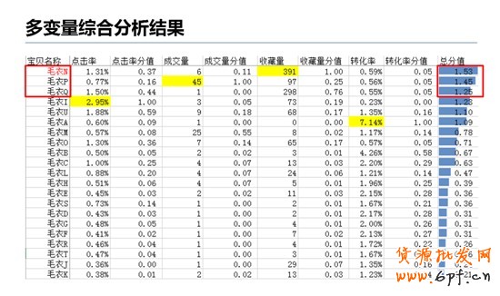 基于此理,我們也可以計(jì)算出店鋪寶貝毛衣A的綜合得分。但是否將毛衣A的點(diǎn)擊率、成交量、收藏量和轉(zhuǎn)化率相加即可得出呢?如果你將這四個維度的數(shù)值進(jìn)行相加,只會得到一個錯誤的結(jié)果,因?yàn)槊總€維度的數(shù)值單位不同,是不能相加的。所以我們必須找到一個科學(xué)的計(jì)算方法,這就是下面將要講到的“多變量綜合評價法”。