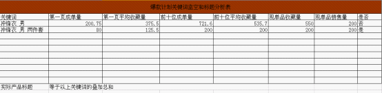 這個大家相信多是很懂的,就不用我多說了,相信派代里面有一大堆關(guān)于這類高手的文章,我這邊只是用表格進行了統(tǒng)一化的管理,其實意思很簡單,說白了就是按照當(dāng)前銷售把關(guān)鍵詞分層幾個階段,比如:200單銷售額 500收藏,這樣的記錄已經(jīng)能匹配到如:沖鋒衣 男 兩件套這樣的關(guān)鍵詞的第一頁了,結(jié)果你不知道所有沒做,那你就吃虧了。
