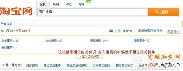 剛開始的時候我是隨便定義寶貝名稱的,每天通過搜索進入店鋪的顧客少之又少,后來在論壇上看到了一下關于關鍵詞的帖子,于是也抱著嘗試的心情改了一下,效果還真是很明顯,很快就有通過寶貝搜索進入咱鋪子里,我認為選擇關鍵詞一是要換位思考,比如我們賣的是麗江披肩,我會去淘寶麗江披肩,下面會出來一系列的關鍵字,我都會一一搜集下,發布寶貝的時候就多用這些關鍵字。