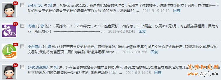 的確,這樣其實(shí)也是一種很好的描述自身的方式,因?yàn)樵谝粋€(gè)論壇之中,我們往往需要推銷自己,我們需要做自己的業(yè)務(wù),記得以前知道藍(lán)冰互聯(lián)的時(shí)候,也是通過論壇看到他們的帖子,然后知道他們的網(wǎng)站,最后再去看一下他們的評(píng)價(jià),最終確認(rèn)了他們的服務(wù)還不錯(cuò)的觀點(diǎn),其實(shí)很多時(shí)候,一條短消息是一個(gè)營(yíng)銷的門道,在很多時(shí)候,我們都會(huì)想到那些硬推廣,卻不屑于使用這些小的推廣模式;其實(shí)如果一個(gè)論壇可以保證相關(guān)性的話,這樣一點(diǎn)可以很值得讓我們用到,而且在個(gè)人空間里留言,也是一種外鏈的制作方式,如圖:
