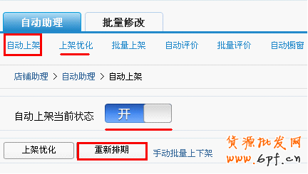 4.如果掌柜對自己的上架計劃不滿意,想重新進行設(shè)置,可點擊“重新排期”(上圖),或者通過點擊“自動助理”欄的自動上架→重新排期 進入(下圖)。這個功能能幫助掌柜重新設(shè)置寶貝上架時間。