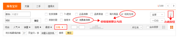 大嘴分析:價格搜索排序有2個前提條件,就是要旺旺在線,加入消費者保障,這兩項是價格排序的默認勾選項。小伙伴,你注意到了嗎?!