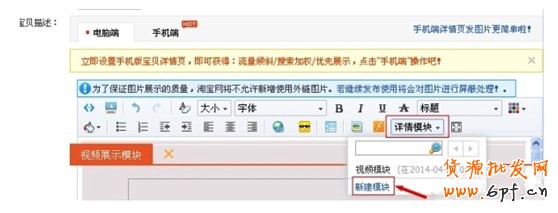 第一步,在編輯寶貝頁面的詳情描述編輯器里,選擇詳情模塊,并新建一個(gè)模塊,如下圖: