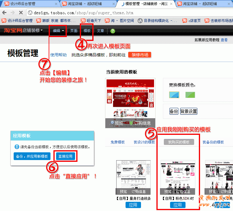 【第一步】購買模板以后,進入店鋪裝修后臺,直接點擊進入: