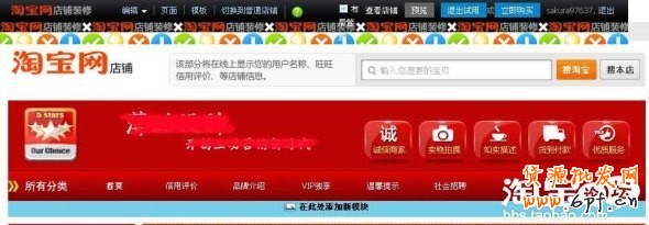 13、返回到剛才的淘寶網店鋪裝修頁面退出試用。點紅色框框的退出試用。為什么要退出試用呢?因為接下來要將剛才復制的代碼粘貼到自己的店鋪里,淘寶是不允許打開兩個頁面的店鋪裝修進行裝修的,所以要先退出試用。