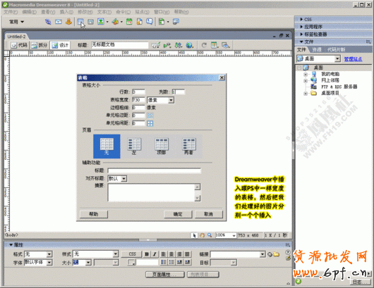 Dreamweaver中插入跟PS中一樣寬度的表格,然后把我們處理好的圖片分別一個個插入。