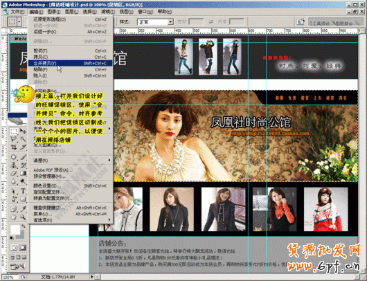 打開我們設計好的旺鋪促銷區,使用“合并拷貝”命令,對齊參考線,我們把促銷區切割成一個個小的圖片,以便使用在網絡店鋪。
