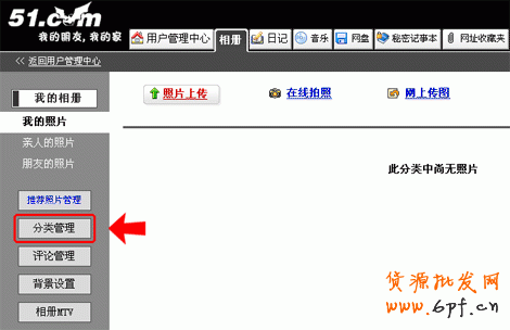 進入相冊后,我們先要建一個存放圖片的分類,以便以后方便管理,點擊左邊的“分類管理”鏈接。