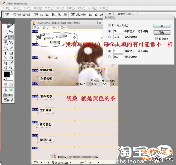 為了打開網(wǎng)頁(yè)時(shí)加快模版顯示出來(lái)的速度,我們需要把模版切成一片片,分別上傳到相冊(cè)上,這樣打開網(wǎng)頁(yè),每個(gè)模版切片同時(shí)顯示,大大減少了頁(yè)面打開的時(shí)間,買家也不會(huì)等到不耐煩了,下面是把模版切片操作: