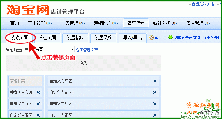 進(jìn)入店鋪裝修頁面后點(diǎn)擊“裝修頁面”