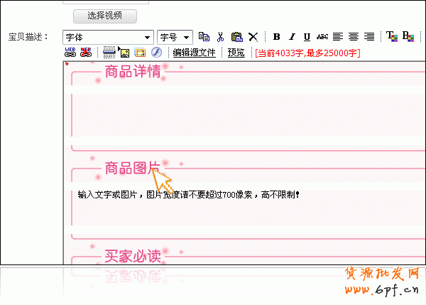 D)插入圖片(方法二)到模板指定位置,如下圖所示:說明:此方法是直接上傳到淘寶空間,需要您先有訂購好圖片空間才可以操作!