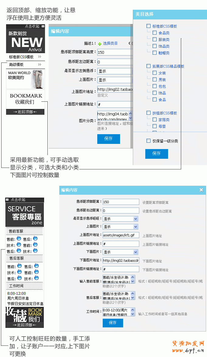 淘寶學堂地瓜從淘寶網論壇里學習得到回答是,除了旺鋪扶植版模板,其他版本的模板都可以有懸浮旺旺、懸浮分類功能哦!大家只有購買了帶懸浮的模板,才可以有這2個功能,自己制作是不支持的(旺鋪旗艦版除外),所以不要在研究和發明了,購買個帶有2側漂浮的模板就可以了哦!!