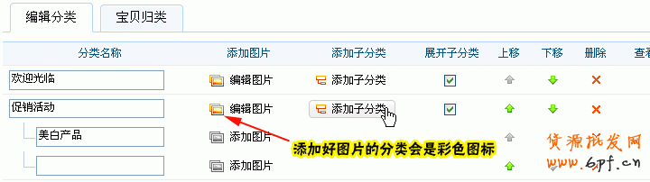 3、進入寶貝分類管理界面,操作如下圖,非常簡單明了;